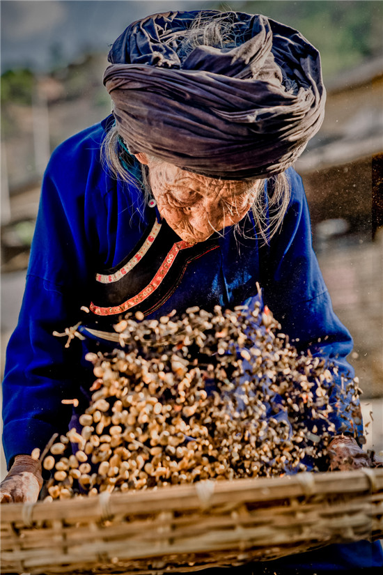90岁的傈僳族老人交蒙阿凤(傈僳语音译)在屋外扬咖啡,一年四季围绕咖啡劳作已成为当地人的生活的一部分。